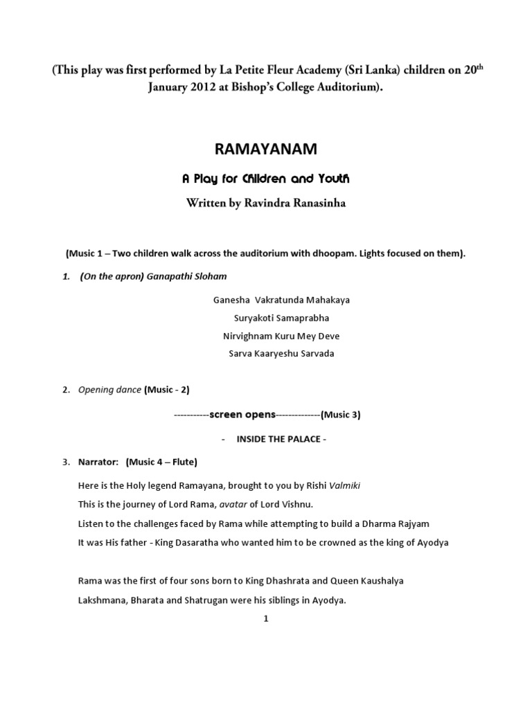 Ramayana Play Script For Kids In English Ramayana Play Script For Kids In English : The curtain opens as the narrator speaks.
