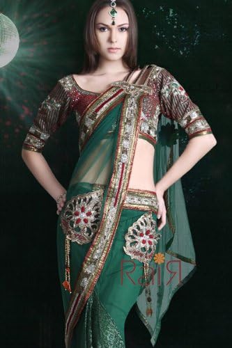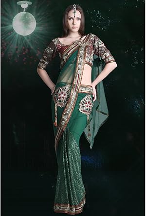 Ready Pleated Butterfly Pallu Saree Ready Pleated Butterfly Pallu Saree : Emerald green ready pleated saree in satin with floral print and ruffle layer on the hem.